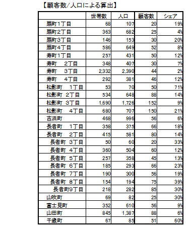 | ○顧客数や調査での出現サンプル数をそのまま世帯数や人口で除したケース こちらのケースが簡単にできます。調査などで出現数が少ない場 合は、数値がかなり小さくなるので、数値を調整します。 商品がパーソナルユースか、世帯ユースかで、人口で除すか、世帯で 除すかは、その都度判断。 |